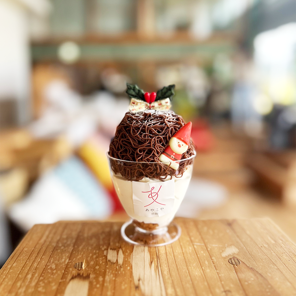 『カフェメニュー』 和栗&ショコラのシフォンモンブラン 単品1,300円(税込) ※別途ドリンクご注文の際には100円引きになります。 クリスマスマーケット期間限定のプレートです。 和栗&ショコラのモンブランソフトクリーム 650円(税込) クリスマスマーケット期間限定のモンブランソフトです。 絞りたてモンブラン 単品1,540円(税込) ドリンクセット1,870円(税込) 香り立つ和栗を贅沢に使用した絞りたてモンブランです。 洋梨のパフェ 1,430円(税込) 洋梨・キャラメルムース・フランボワーズソースを組み合わせたパフェ。 シャインマスカットのパフェ 1,540円(税込) 柏崎産のシャインマスカットを使用したぶどうのジュレパフェに自家製クッキーを添えました。 モンブランパフェ 1,430円(税込) ほうじ茶のゼリーとプリンやシフォンに生クリーム、 白玉と和栗のモンブランで仕上げました。 ※仕入れ状況でフルーツやデザインが変わる場合もございます。 あやこやぜんざい(ほうじ茶付き) 770円(税込) 綾子舞の里で育ったこがねもちと自家製つぶ餡の甘さ控えめなおしるこ。 あやこやケーキセット 968円(税込) 店ショーケース内のケーキ+コーヒードリンクはコーヒー、紅茶、緑茶からお選び下さい 『ドリンクメニュー』 ・コーヒー (ホットorアイス) 450円(税込495円) ・紅茶 (ホットorアイス) 450円(税込495円) ・緑茶 (ホットorアイス) 350円(税込385円) ・抹茶ラテ (ホットorアイス) 550円(税込605円) ・和栗のモンブランソフト 580円(税込638円) ・ソフトクリーム 400円(税込440円) ・越後姫の生ジュース 530円(税込583円) 『テイクアウトメニュー』 ・コーヒー (ホットorアイス) 400円(税込432円) ・抹茶ラテ (ホットorアイス) 450円(税込486円) ・越後姫の生ジュース 530円(税込572円) ・ソフトクリーム 400円(税込432円) ・和栗のモンブランソフト 580円(税込626円) ・越後姫のかき氷 1,100円(税込1,188円) ・グラデーションクリームソーダ 700円(税込) 和栗のモンブランソフトソフトクリーム越後姫の生ジュース紅茶アイスティー緑茶緑茶アイス